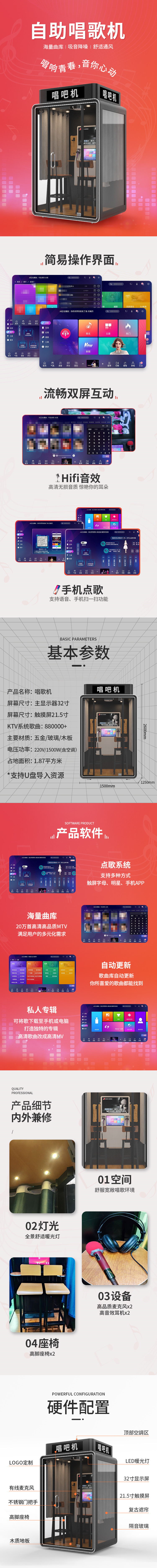 產品特點:這款豪華版唱吧機箱是采用的半掛形式,整體看起來非常美觀大氣,占地面積1.87平方米。KTV系統歌曲88萬+,支持U盤導入歌曲,不定時更新曲目,可手機點歌 支持語音、手機掃一掃功能,HIFI音效 高清無損音質 驚艷你的耳朵!