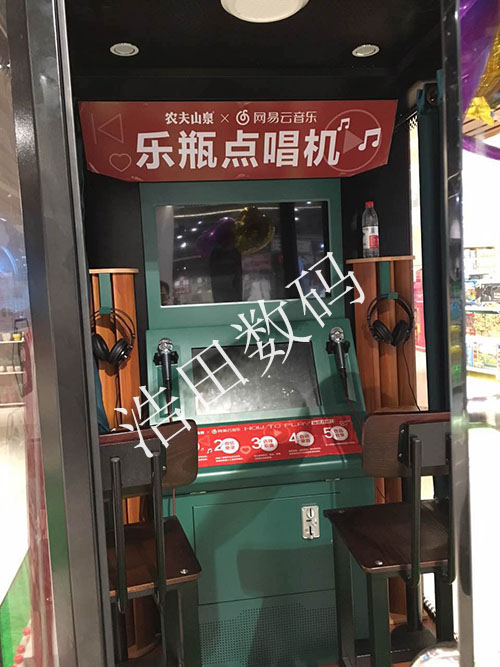 商家案例,例如商場,商場是眾多品牌匯聚的空間,如何搶奪消費者,入駐商家必然要吸引顧客的注意力,產品信息易于接受的,搶眼的,產品與消費者達成互動影響。浩田之前為網易云和農夫山泉定制廣告版的迷你ktv“樂瓶點唱機”,通過機身的噴畫,在賣場上吸引了大批眼球,重塑了品牌形象和消費者認知,帶動消費。