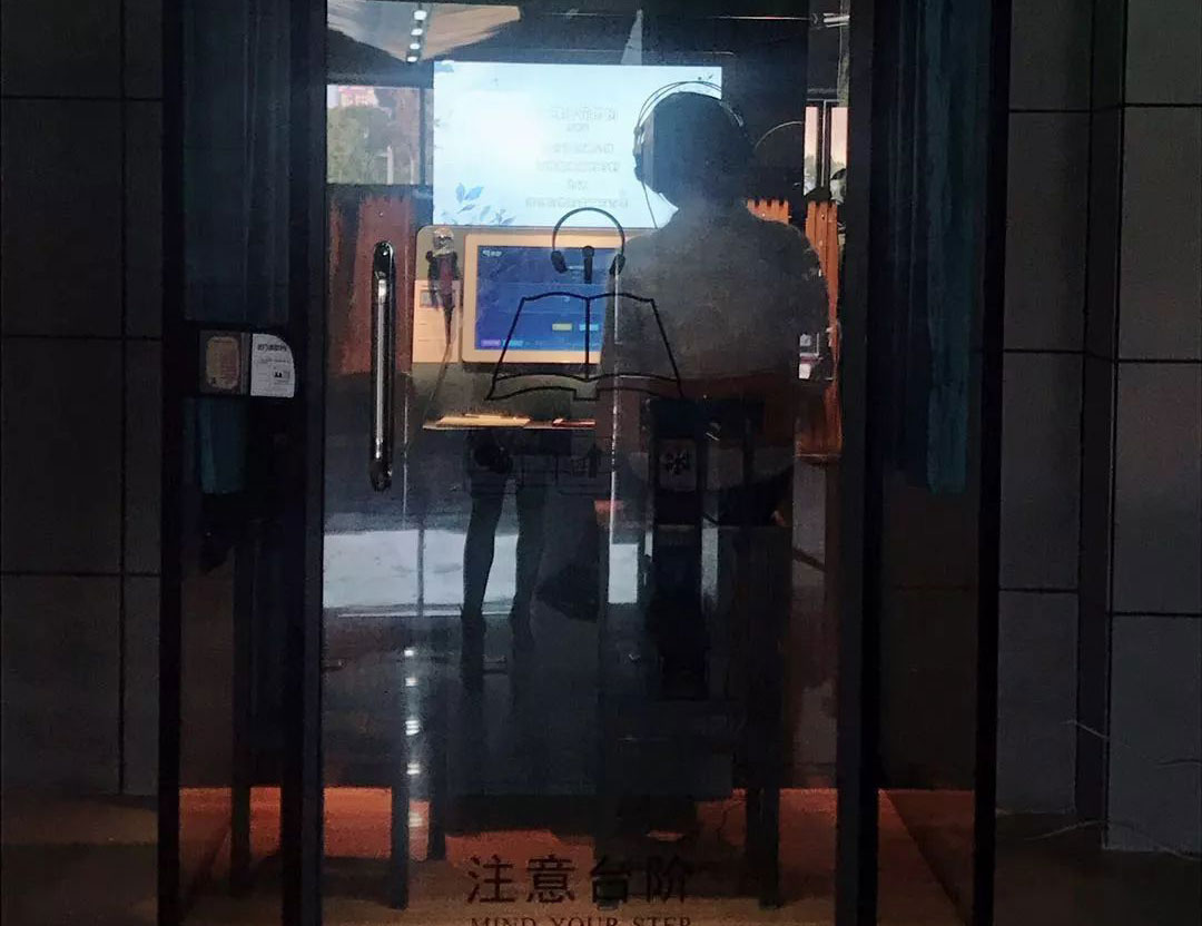在該圖書館二樓看到這座朗讀亭,高約3米,寬約1.6米,四周以隔音玻璃圍成,亭內正前方有兩塊屏幕用以顯示操作系統和播放篇目,兩套朗讀設備包括耳機和話筒分列屏幕兩側,可供兩位朗讀者同時使用。